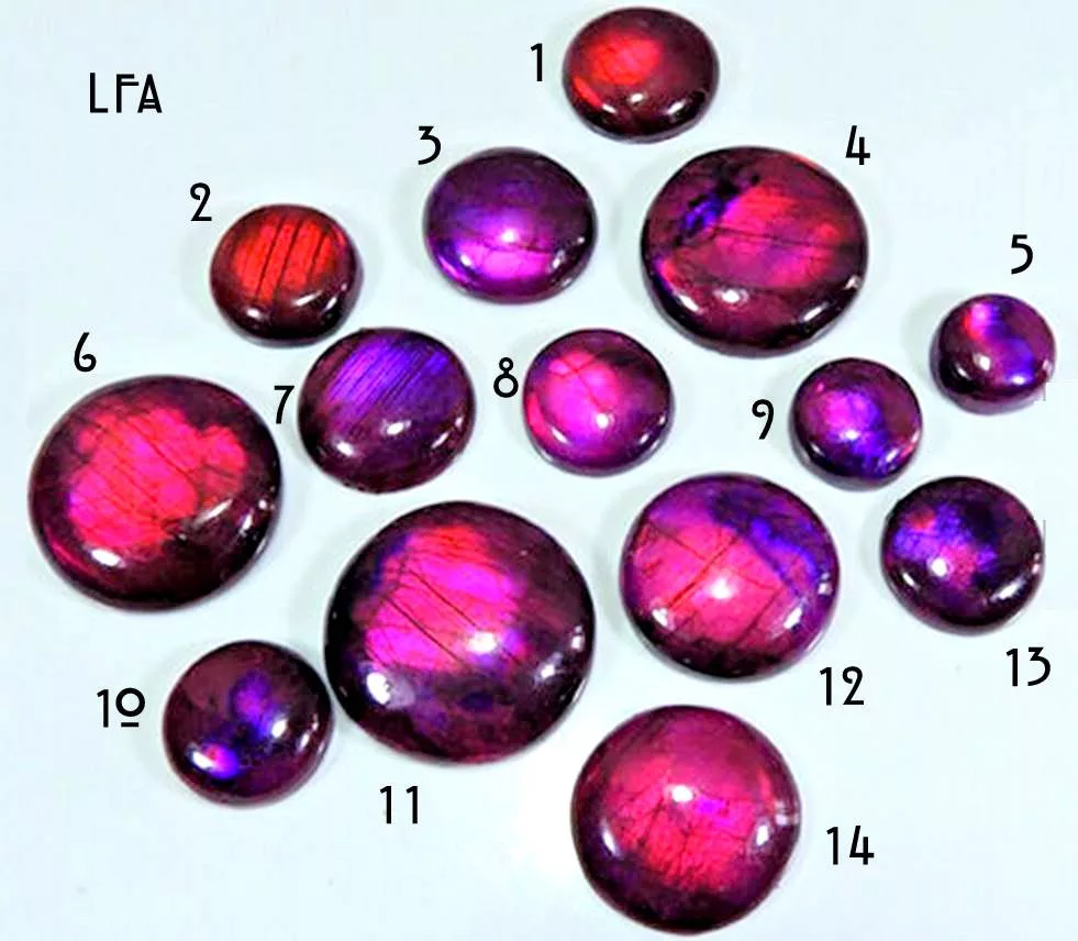 Labradorit kaboson - fukszia - vegyes méret - kerek (LFA1-14)