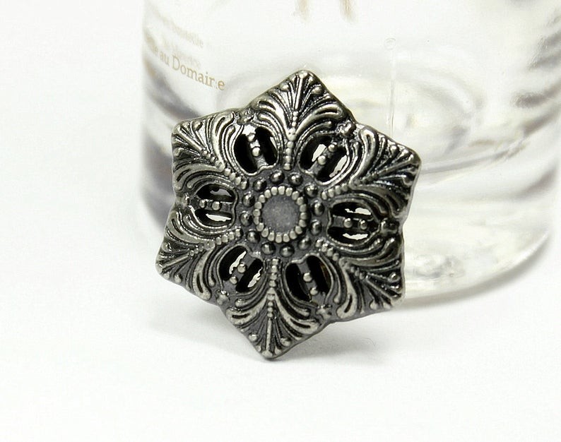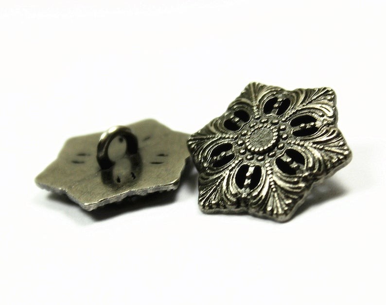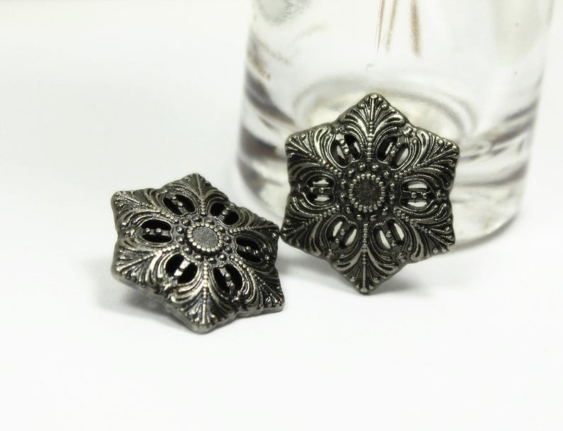 Antikolt hatású fémgomb gyöngyhímzéshez. Az akasztót lecsípve kabosonként használható, befoglalható.